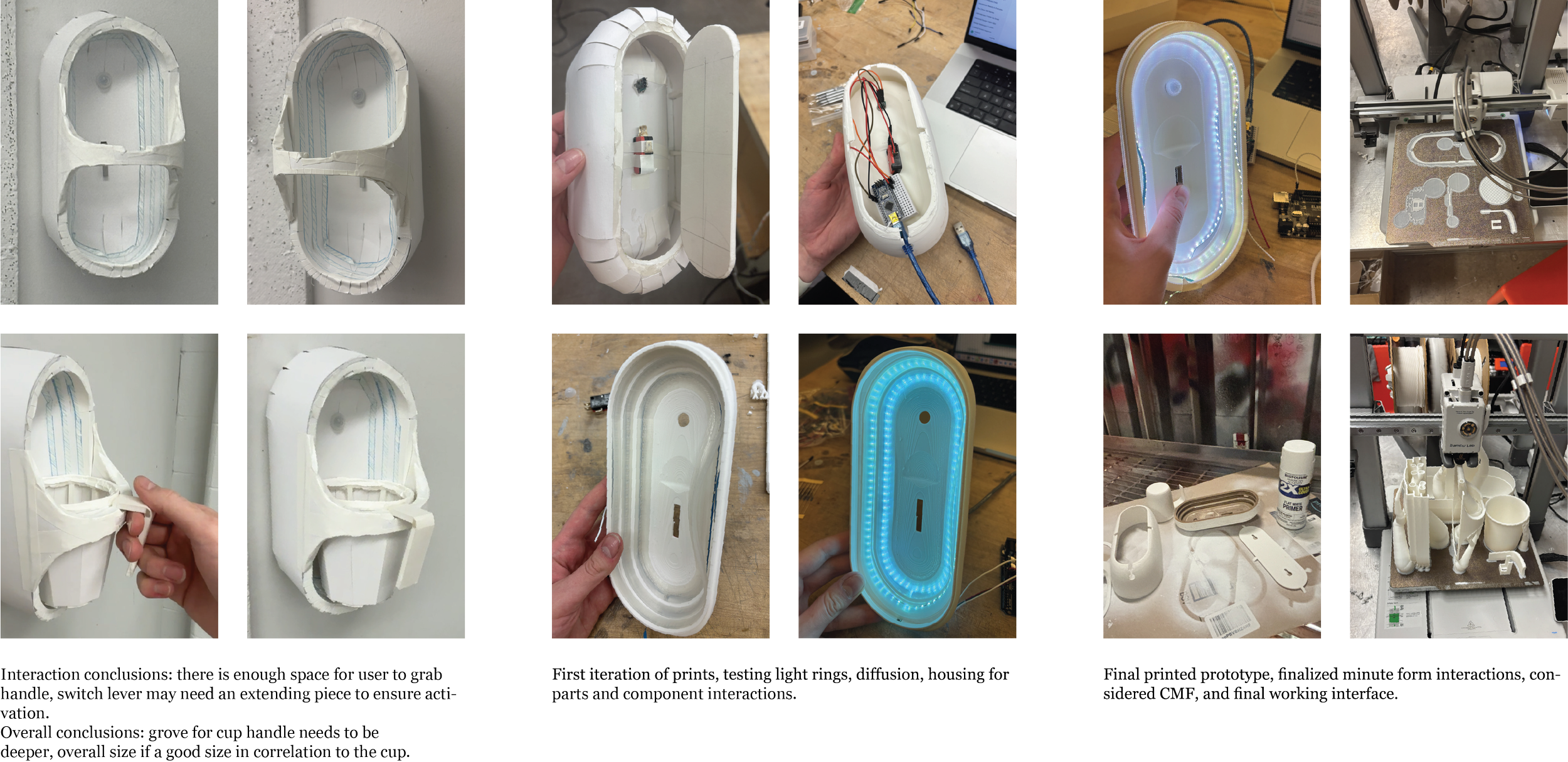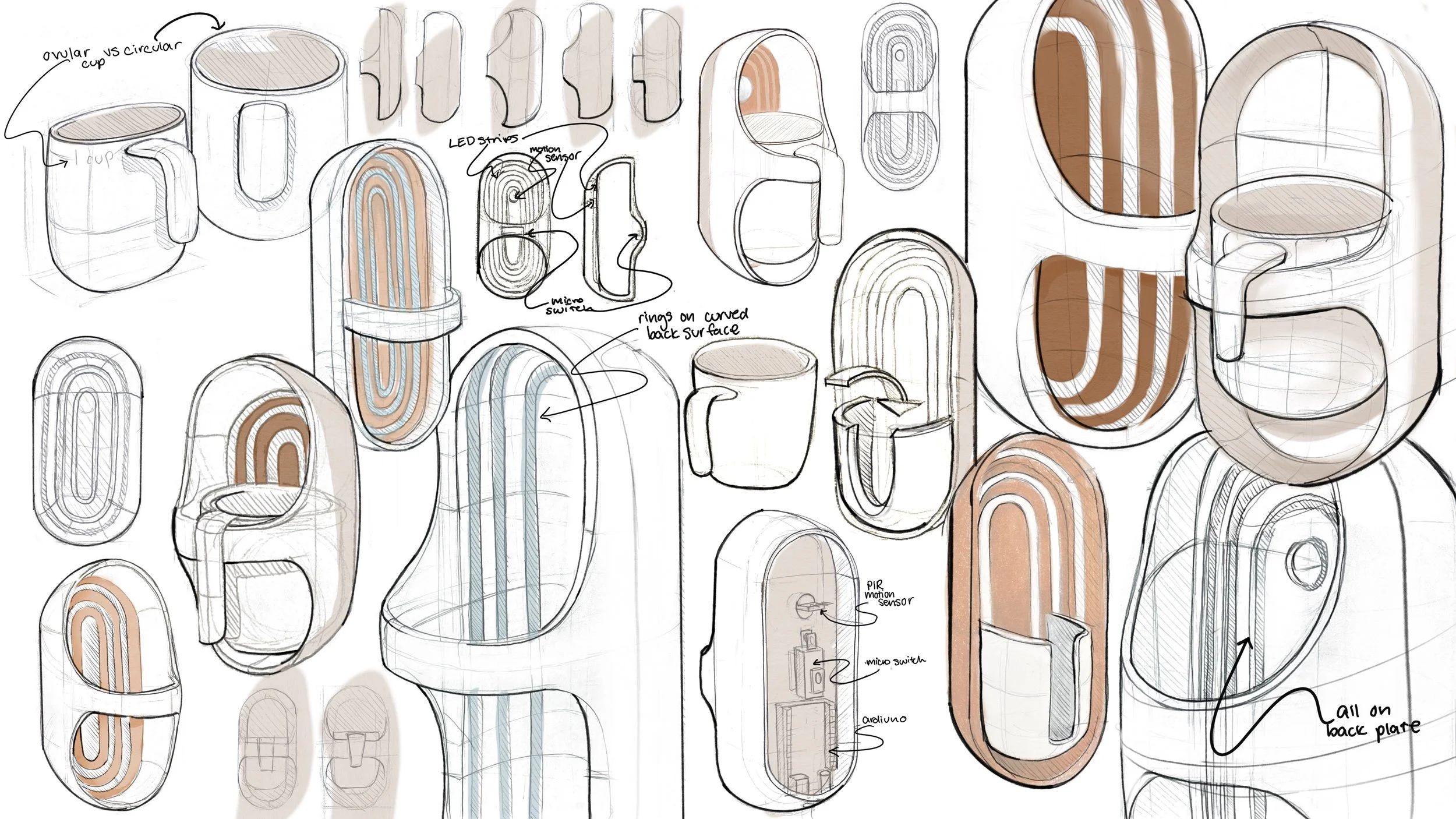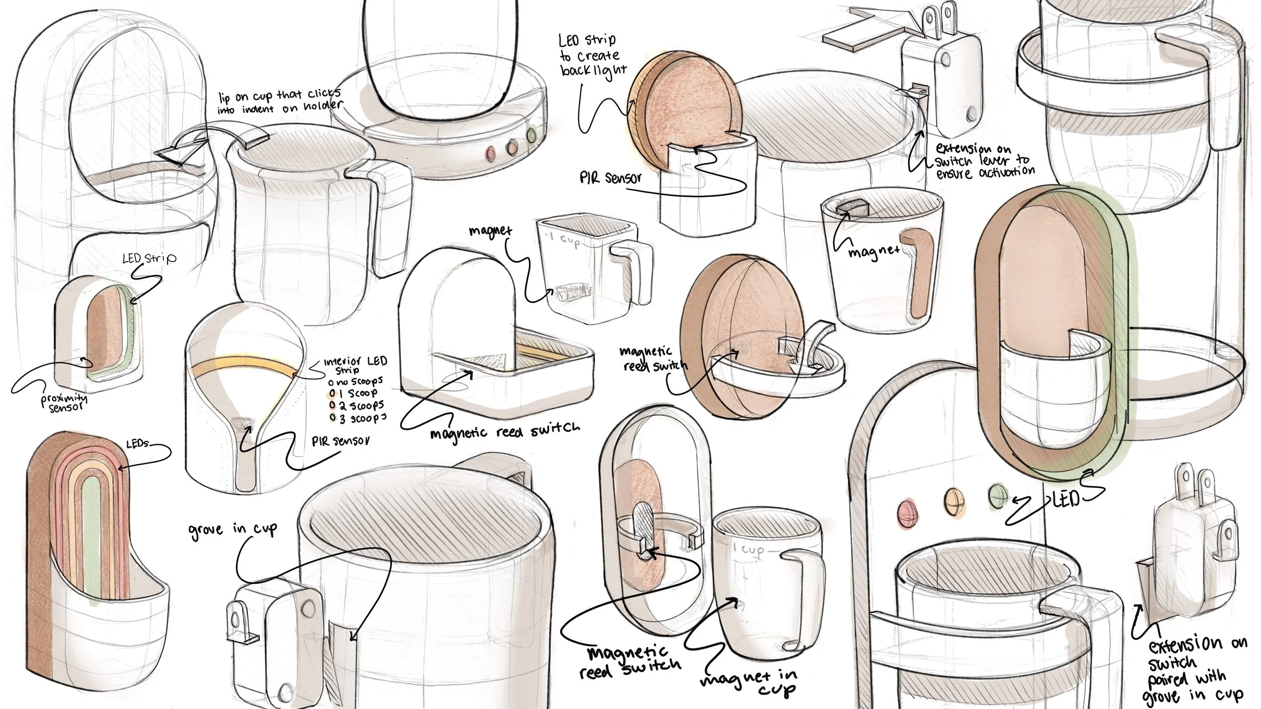 Explored lighting placements, cup and holder interactions, and internal components to finalize design..